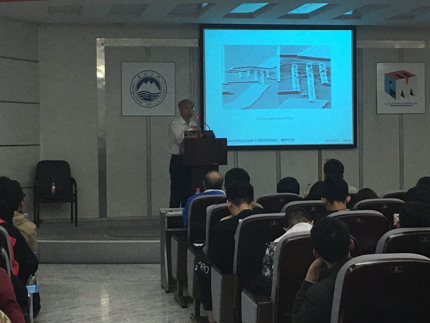 两位教授介绍了近期在国际磁性材料研究领域的新趋势及新动态,并展示了他们科研团队最近的研究成果,包括:纳米级坡莫合金线的制备方法及其磁畴钉扎及移动的表征手段和最新的纳米级电子隧道效应器件设计和制备。并与参会师生进行了充分的交流。会后,洪連輝教授和吳仲卿教授与我院副院长祁阳教授、裴文利副教授、EPM实验室崔伟斌教授等师生进行了进一步的学术讨论。